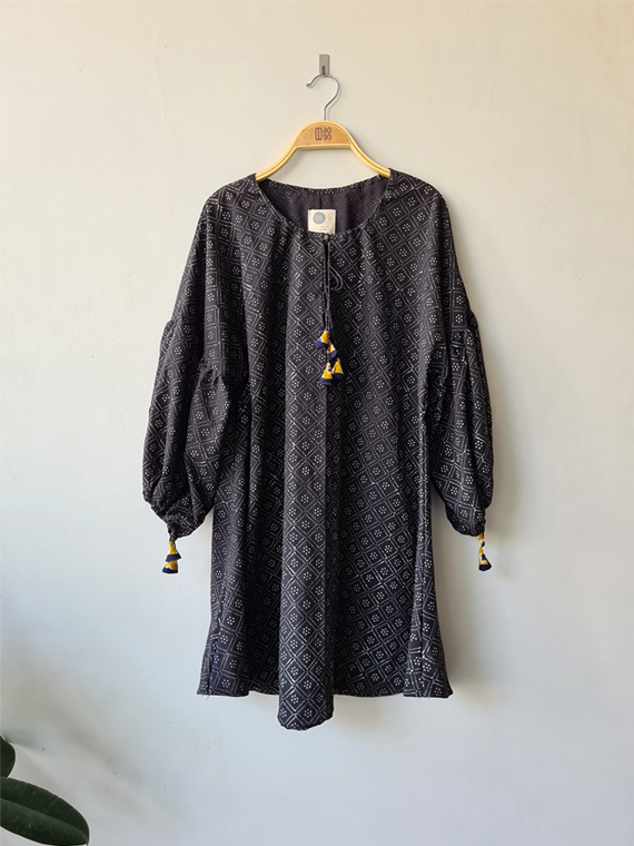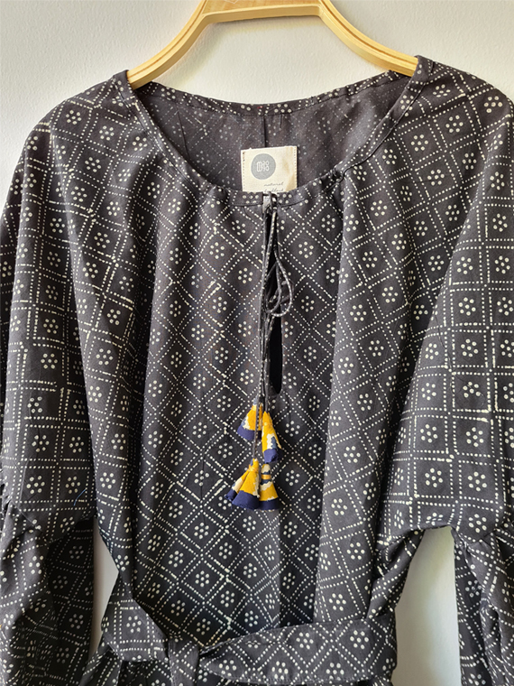 One piece dress with a matching mask Side length 77 cm Front length 84 cm Bust up to 132 cm Arm hole up to 19 cm Material : Hand Block Printed Cotton (Handprint). The hand stamping method makes each piece of the pattern unmatched and makes it unique.