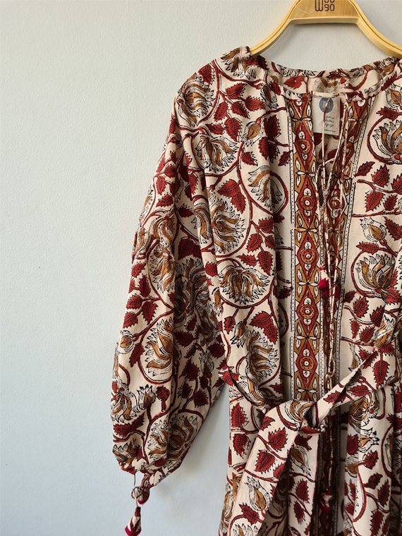 One piece dress with a matching mask Side length 77 cm Front length 84 cm Bust up to 132 cm Arm hole up to 19 cm Material : Hand Block Printed Cotton (Handprint) with floral pattern. The hand stamping method makes each piece of the pattern unmatched and makes it unique.