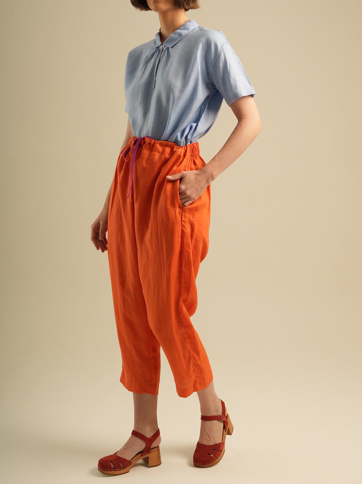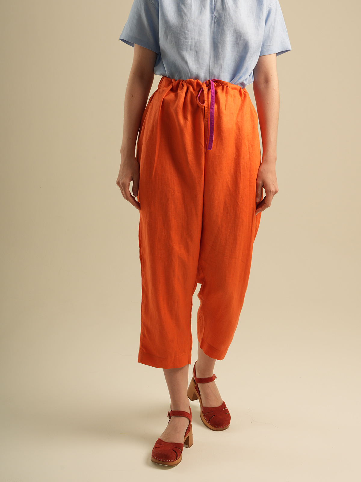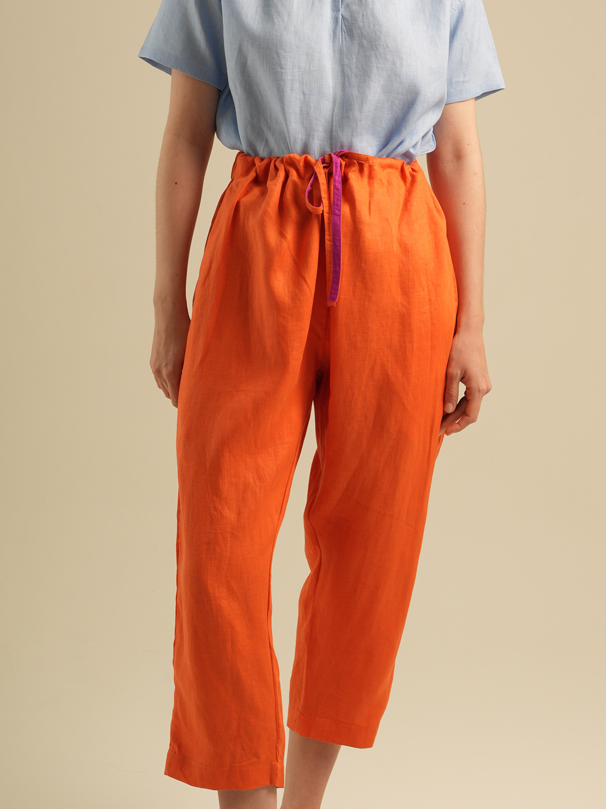 Crop pants,elastic waist with drawstring. Made of 100% Premium Linen